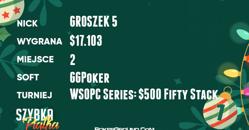 Świetnie w rozgrywce WSOPC Series: $500 Fifty Stack radził sobie GROSZEK 5, który przebojem wdarł się na finały stół. Niestety zabrakło nieco pary w heads-upie i nasz gracz musiał pogodzić się z drugim miejscem. Na osłodę otrzymał $17.103.