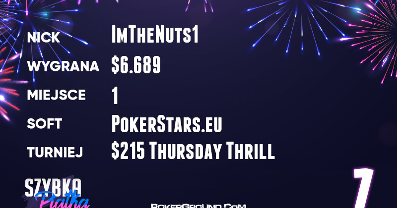 Wczorajszy dzień niezwykle udanie rozpoczął ImTheNuts1, który nie dał szans rywalom w porannym $215 Thursday Thrill. W efekcie, dopisał do swojego konta $6.689, a także zgarnął fotel lidera dzisiejszego rankingu.