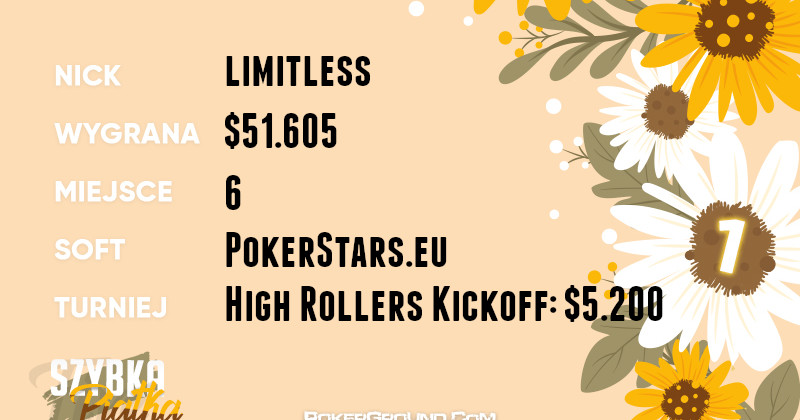 Limitless ma to w zwyczaju, że jak już pojawia się w „Szybkiej Piątce” to zawsze prezentuje jakieś okazałe, pięciocyfrowe dzieło. Nie inaczej jest i tym razem. Nasz reprezentant zajął szóste miejsce w turnieju High Rollers Kickoff: $5.200, za co otrzymał $51.605.