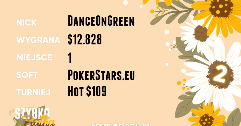 Fantastyczny poniedziałek zafundował sobie wicelider rankingu – DanceOnGreen, który w niespełna w cztery godziny, zarobił ponad dwanaście tysięcy dolarów. Akcja miała miejsce w rozgrywce Hot $109, którą nasz reprezentant wygrał.