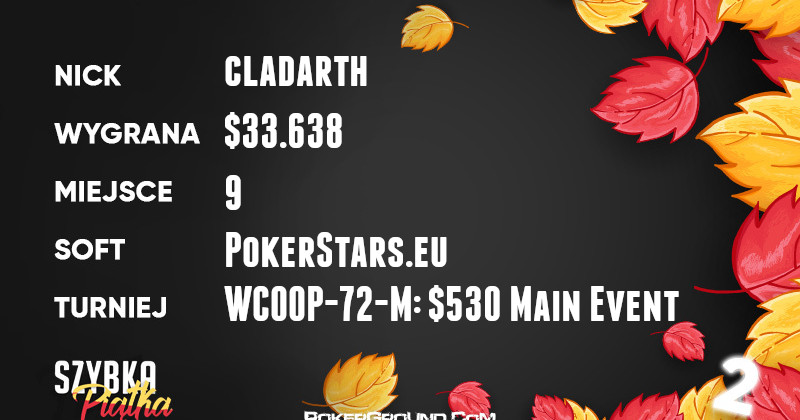Z niezłej pozycji startował też cladarth, który znalazł się wśród najlepszej dziewiątki w rozgrywce WCOOP-72-M: $530 Main Event. Niestety „łotrzyk” nie był zbyt przychylny dla naszego gracza, który ostatecznie zakończył zmagania na dziewiątym miejscu. W efekcie na jego konto powędrowało $33.638.
