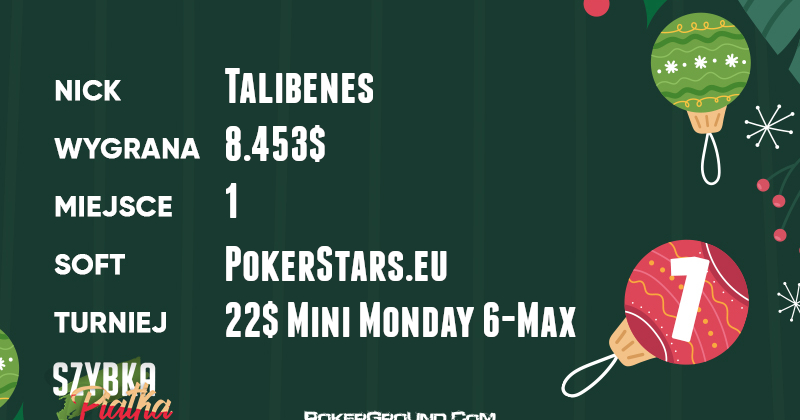 Szykujecie się do rodzinnych spotkań, dlatego nie będziemy specjalnie przedłużać. Najlepszym wynikiem może pochwalić się w tym wyjątkowym dniu Talibenes, który triumfował w evencie 22$ Mini Monday 6-Max. Do jego kieszeni trafiło ponad 8.000$.