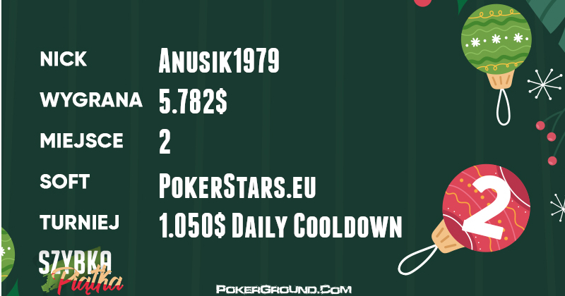 Równie okazałym wynikiem może pochwalić się Anusik1979, który zrobił sobie prezent pod choinkę o wartości 5.782$. Sukces przyszedł już pod sam koniec sesji – Polak zajął drugie miejsce w evencie 1.050$ Daily Cooldown.