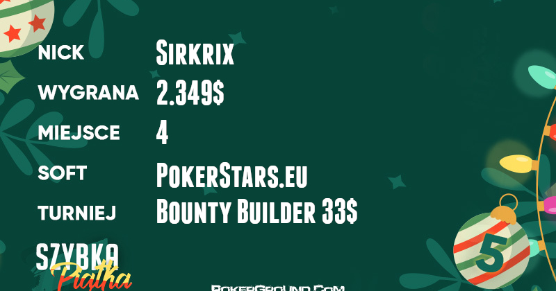 W wigilijny poranek mamy ostatnie przedświąteczne zestawienie najlepszych wyników, jakie nasi gracze osiągnęli ostatniego dnia w turniejach MTT online. Na czele zestawienia znajduje się Fatty_Bun44, który na PokerStars zajął 3. miejsce w turnieju 55$ Mini Bounty Builder. Za ten wyczyn Polak pod choinką znajdzie 7.811$.