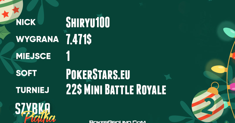 Innym graczem którego chcemy dzisiaj wyróżnić, jest Shiryu100. Nasz gracz zwyciężył w evencie 22$ Mini Battle Royale i tym samym zarobił 7.471$, co daje mu drugie miejsce w dzisiejszej Szybkiej Piątce.