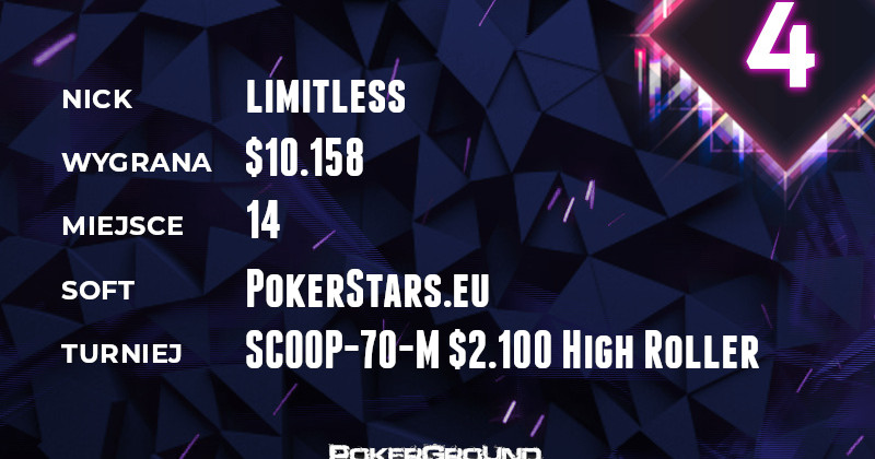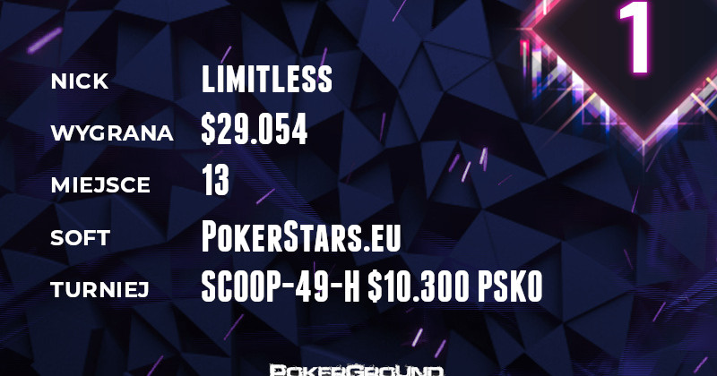 Bohaterem dzisiejszego zestawienia, chociaż pewnie nie w takim wymiarze jakim by chciał, został limitless. Toczył on zażarte boje w eventach SCOOP o bardzo wysokim wpisowym. Ostatecznie, nie udało się w żadnym zaliczyć chociażby stołu finałowego. Łącznie jednak, zarobił ponad czterdzieści tysięcy dolarów.