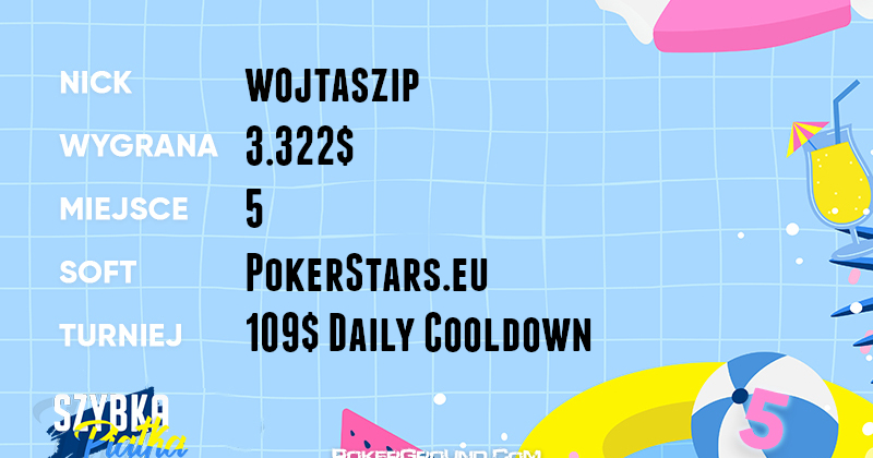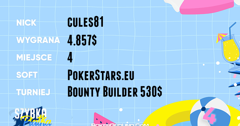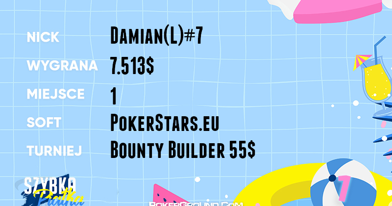 Dzisiejsze zestawienie wygrał Damian(L)#7. Polak nie tylko uzyskał najlepszy wynik w Szybkiej Piątce, ale również triumfował w evencie Bounty Builder 55$. Jego perfekcyjny występ został sowicie wynagrodzony – na koncie naszego gracza PokerStars zaksięgowało 7.513$.