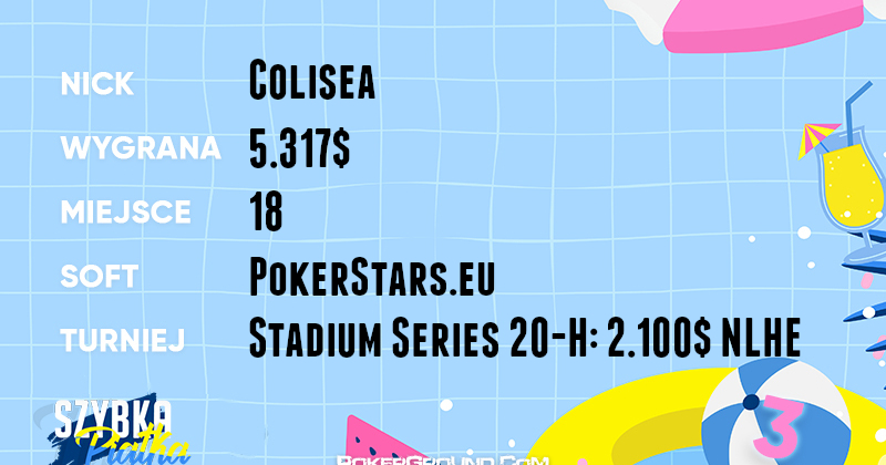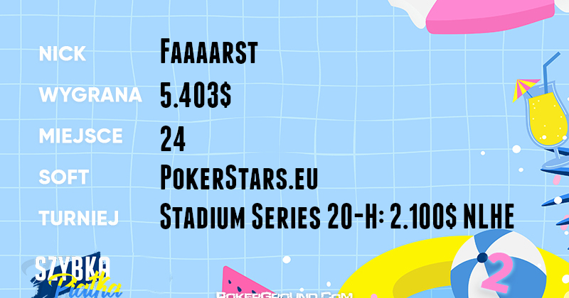 Innym graczem, którego chcemy dziś wyróżnić, jest Faaaarst. W dwudniowym evencie Stadium Series Heat 20-H: 2.100$ NLHE Polak zajął 24. miejsce i dzięki temu wzbogacił się o 5.403$. Wprawdzie Colisea uplasował się na o sześć oczek wyżej, jednak zgarnął trochę mniej skalpów i ostatecznie zarobił o 100$ mniej. Tak czy tak, obu graczom serdecznie gratulujemy.