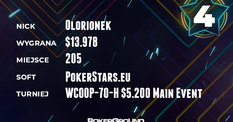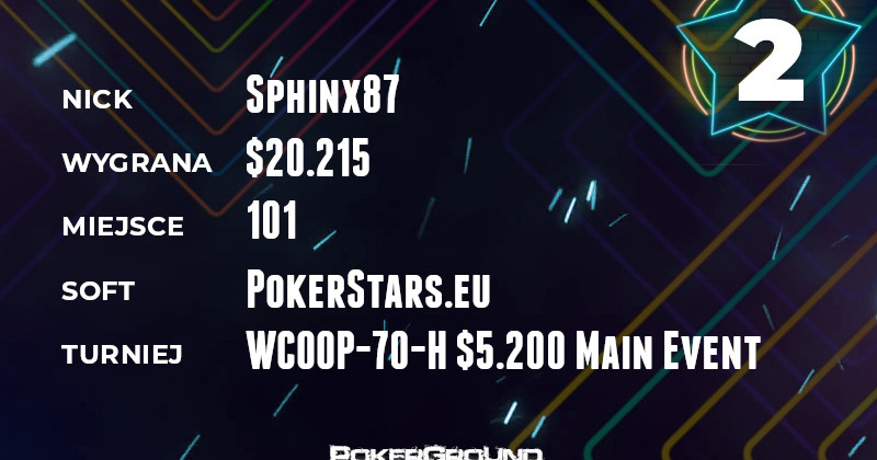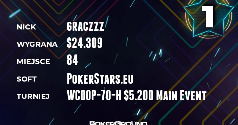 Najdalej w WCOOP-70-H $5.200 Main Event zawędrował graczzz, który swój udział zakończył na 82 pozycji, wartej $24.308. Z kolei w Turnieju Głównym fesitwalu GALACTIC, najlepiej spisał się SoldeAlma. Za 11 miejsce otrzymał $5.766, jednak nie wystarczył to, by znaleźć się w dzisiejszym rankingu.
