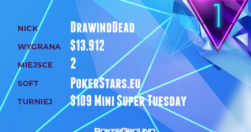 Zanim jednak o mistrzostwie, przedstawiam Wam lidera dzisiejszego zestawienia, którym został gracz o nicku DrawindDead. Jak się okazało, w „dobieranki” szło mu na tyle dobrze, że dotarł do finałowej rozgrywki w turnieju $109 Mini Super Tuesday. Tam porozumiał się z przeciwnikiem, ostatecznie zgarniając drugie miejsce i $13.912.