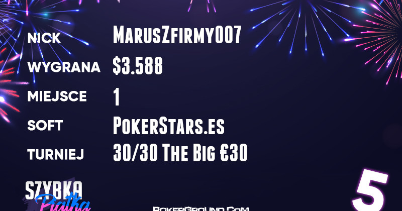 Graczem, który wśród najlepszej piątki może pochwalić się zwycięstwem, jest MarusZfirmy007. Nie dał on żadnych szans rywalom w evencie 30/30 The Big €30, rozgrywanym na platformie PokerStars.es. Za swój wyczyn zgarnął $3.588.