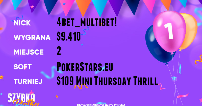 Jak co czwartek, liczymy na dobre występy naszych w serii Thursday Thrill. Sztuka ta udała się w evencie Mini z wpioswym $109, gdzie 4bet_multibet! zajął drugie miejsce. Do kasy udał się po wypłatę w wysokości $9.410.