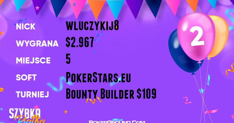 Drugie miejsce wędruje do wluczykija8, który na trasie z Doliny Muminków w nieznane, wystąpił w turnieju Bounty Builder $109. Ostatecznie zameldował się na miejscu piątym, a do kieszeni wpadło mu $2.967.