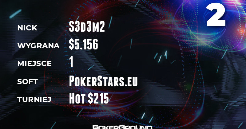 Wiceliderem i jednocześnie jedynym graczem w stawce, który może pochwalić się zwycięstwem, jest inny stary wyjadacz S3d3m2. Nie miał on sobie równych w turnieju Hot $215, za co otrzymał $5.156.