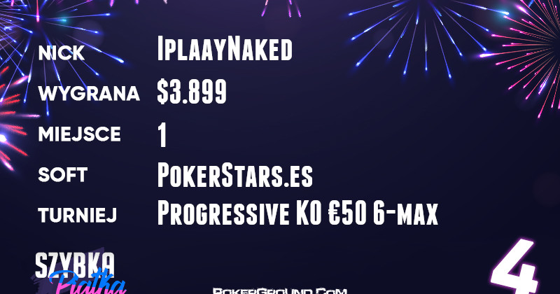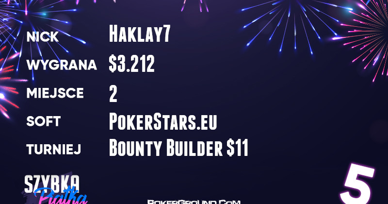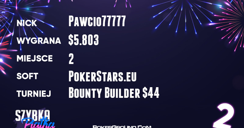 Drugie miejsce i bardzo przyjemny zarobek zaliczył Pawcio77777. Został on runner-up w turnieju z serii Bounty Builder. Wpisowe $44 zamienił na wypłatę wynoszącą $5.803.
