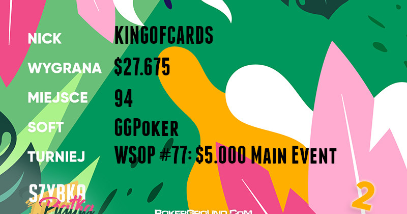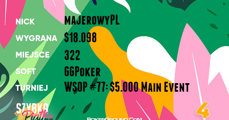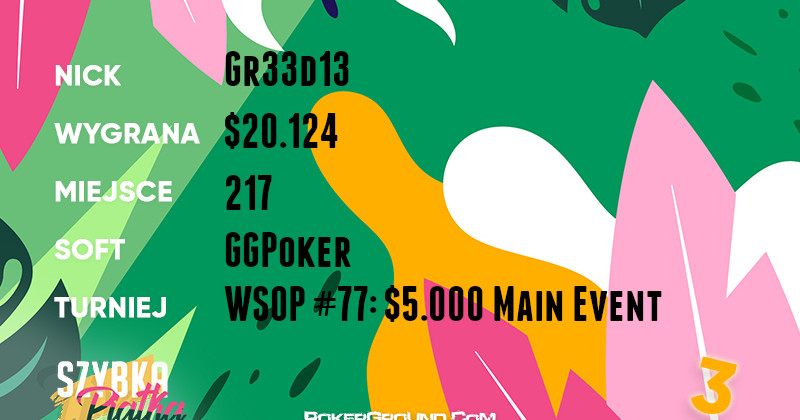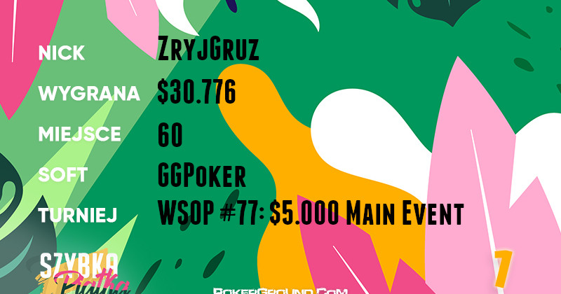 Co prawda WSOP #77: $5.000 Main Event wciąż trwa i mamy w grze jednego reprezentanta, to jednak nie mogliśmy czekać do przyszłego tygodnia, żeby wyróżnić graczy, którzy już zmagania zakończyli. Z tej grupy najdalej dotarł ZryjGruz, który zajął miejsce sześćdziesiąte i zgarnął $30.776.