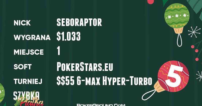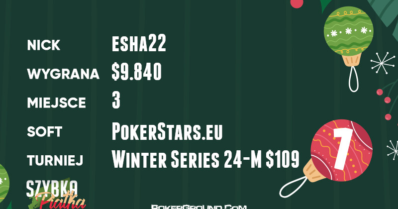 Wspominany we wstępie akcent, to bardzo dobry wynik gracza o nicku esha22. Miało to miejsce w evencie 24-M $109 6-max Hyper-Turbo PSKO festiwalu Winter Series. Nasz reprezentant zameldował się w nim na trzecim miejscu, za co otrzymał $9.840.