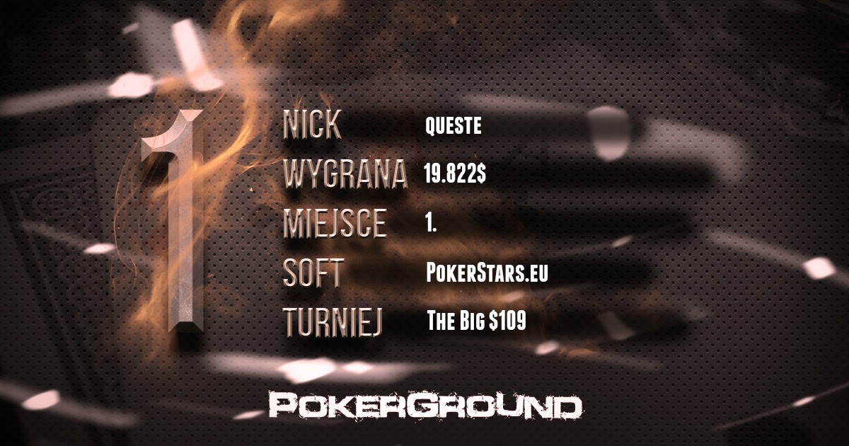 Dzisiaj możemy pogratulować kolejnemu Polakowi zwycięstwa w „bigu” tym razem z wpsiowym $109. Osobą, która zgarnęła sześciocyfrową kwotę 19.822$ jest dobrze znany regulars queste.