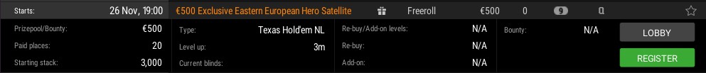 Już 27 listopada, o godz. 19:00 Unibet zaprasza do stołów graczy z krajów takich jak: Polska, Węgry, Rumunia, Estonia, Gruzja, Bułgaria, Łotwa, Czarnogóra, Słowenia oraz Słowacja do udziału w evencie The Eastern European Hero. Normalnie wpisowe do tego wydarzenia wynosi 25€ – w puli gwarantowanej czeka na Was 3.000€ – ale my pokażemy Wam, w jaki sposób ZA DARMO dołączyć do gry.