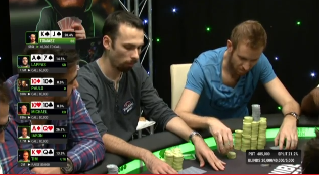 . Tak też uczynił przesuwając 595k w żetonach na środek stołu. Pierwotny agresor zrzucił karty, ale Polak został wyizolowany przez „gospodarza” Lightbourne’a, który trzymał