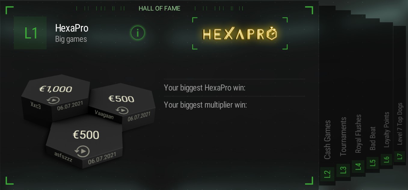 | 3 | 2,500 | Level 3 | €1 Hexapro ticket | 3.5x | 10 | |