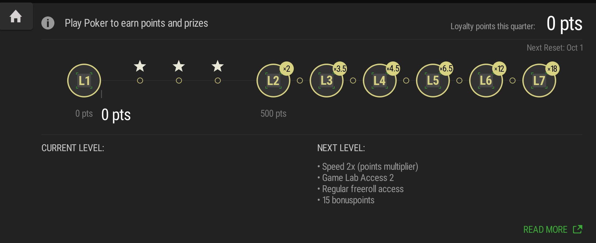 W nowym programie otrzymujecie jeden punkt za każdy 1 cent zapłaconego rake’u. Gromadzenie punktów umożliwi Wam osiąganie wyższych poziomów, a co za tym idzie bardziej wartościowych nagród, do których zaliczają się: punkty bonusowe, bilety, inne bonusy oraz gotówka! Wyższe poziomy dają graczom również dostęp do bardziej rozbudowanych funkcji z tzw. Game Lab (narzędzie statystyczne).