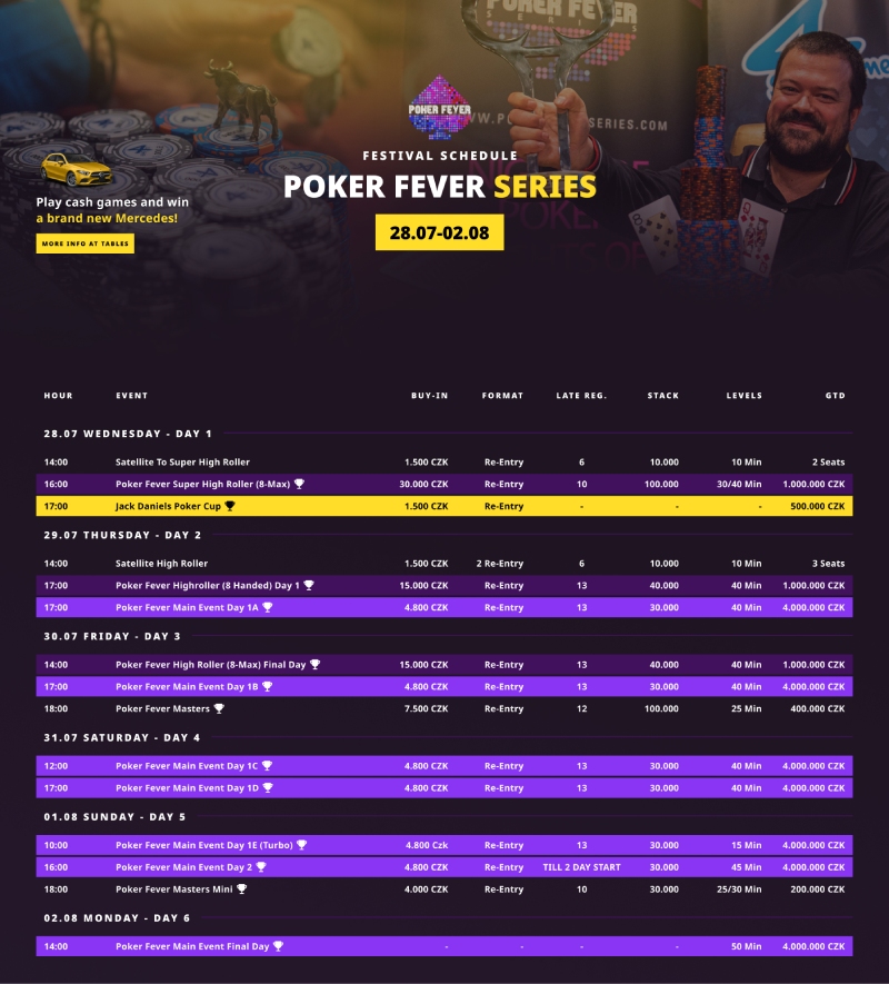 W kolejnych dniach odbędą się jeszcze turnieje Poker Fever Masters z wpisowym 7.500 CZK i Poker Fever Masters Mini za 4.000 CZK.