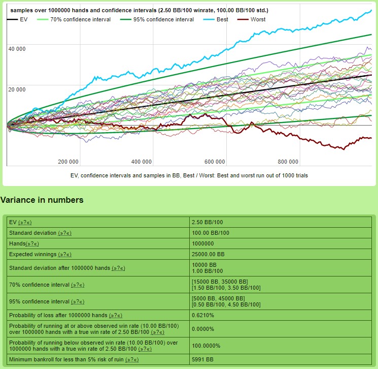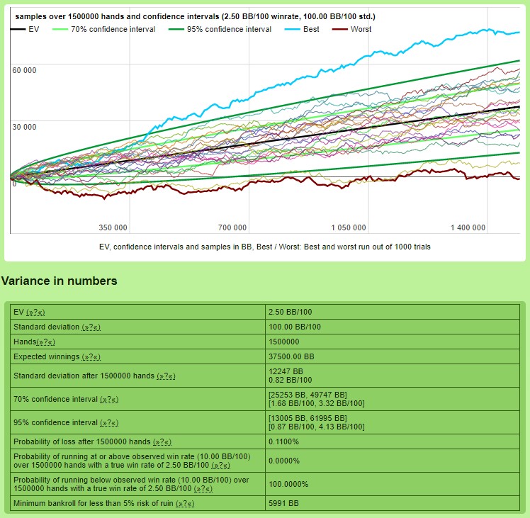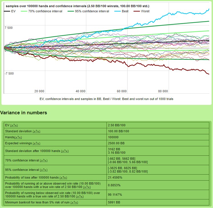 Przykład: Szacujemy, że wygrywamy 2,5 BB/100: