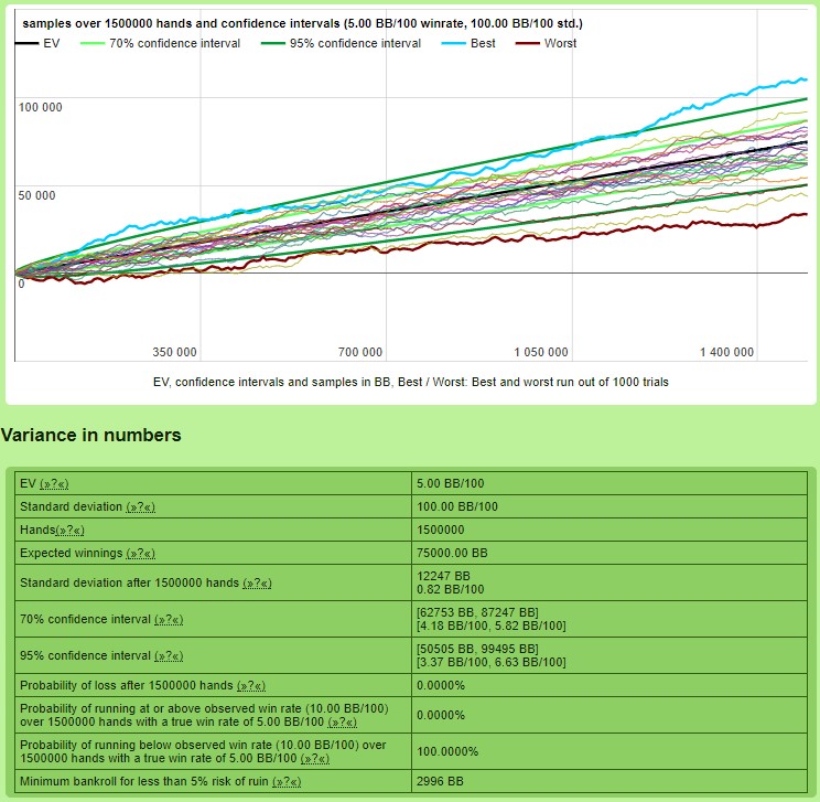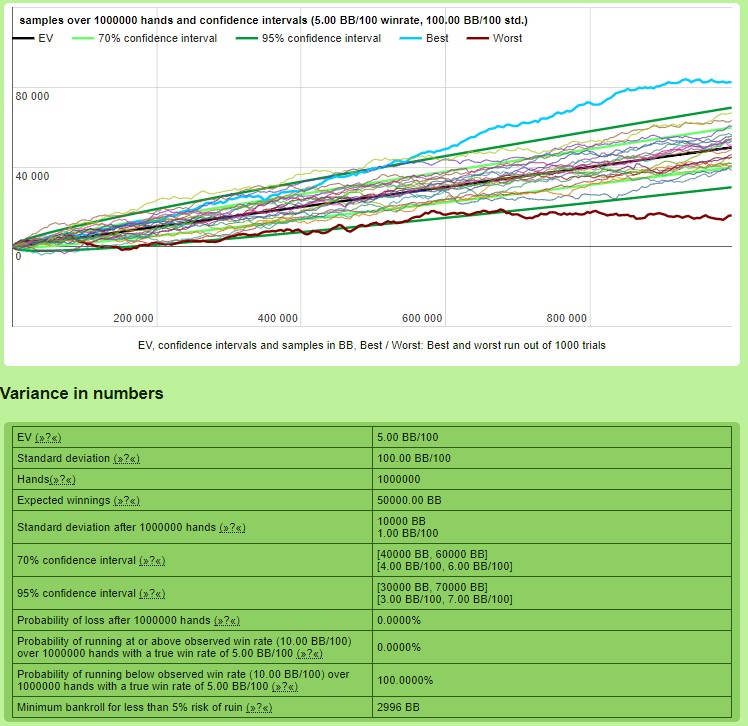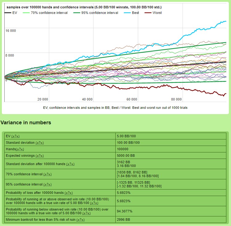 Symulacje pokazują, że jeżeli chcemy pójść drogą na skróty, to właśnie statystyka pokaże nam, że ta po prostu nie istnieje. 100.000 rozdań nie jest żadnym materiałem statystycznym w tym ujęciu, chociaż np. przy analizie danych z trackera jest to już baza, która umożliwia nam wyciąganie wniosków i wprowadzanie korekt (do tego celu potrzeba znacznie mniej materiału).