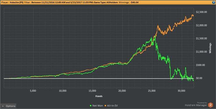 Zauważcie, że przeskoczyć przez kilka poziomów można w ciągu kilkudziesięciu tysięcy rozdań, jednak nie jest to w żaden sposób miarodajna próbka. To wariancja sprawia, że na wyższych, nienaturalnie wysokich i nieadekwatnych do posiadanych umiejętności, stawkach znajdują się gracze, którzy dostali się w to miejsce zwykłym zrządzeniem losu, czytaj dzięki korzystnej dla nich dystrybucji kart. Jeśli należycie do tej grupy, cieszcie się tą chwilą, bo w większości przypadków długo ona nie potrwa. Nie mówię tego jako zgorzkniały i niespełniony grinder, raczej mówię to z perspektywy osoby, która drogę płynięcia z wariancją wielokrotnie przeszła. Zawsze kończyło się tak samo: gdy nadchodziła prawdziwa weryfikacja, zarówno umiejętności, jak i mindsetu, okazywało się, że czas wrócić do podstawówki.