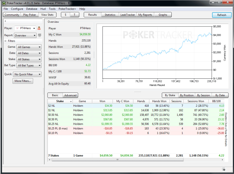 Myślę, że nie możemy dać się zwariować, bo życie nam minie na sprawdzaniu tego, czy aby na pewno jesteśmy w stanie podjąć się kolejnego wyzwania. Jeśli nie gramy zawodowo, wystarczy, że będziemy mieli świadomość, jakie są statystyczne realia i z jakim ryzykiem mamy do czynienia. Od nas zależy, jaki próg tego ryzyka będziemy w stanie zaakceptować. Przy podejmowaniu decyzji o tym, czy czas na trudniejsze wyzwania, musimy ocenić nasze szanse w sposób najbardziej obiektywny. Nie wiem, jak to formalnie ująć, ale chcę powiedzieć, że myślę, że trzeba odwołać się po części do liczb z trackera, a po części do własnych odczuć odnośnie naszej pozycji w puli graczy na limicie, z którego chcemy przenieść się wyżej. Jeśli nawet dla purystów statystycznych znacznie zebranego materiału, z racji niewielkiej próbki (w ogóle nie biorę pod uwagę przypadków poniżej 100.000 rozdań), będzie niewielkie, to dla przeciętnego gracza taka baza stanowi już poważny wyznacznik jego możliwości.