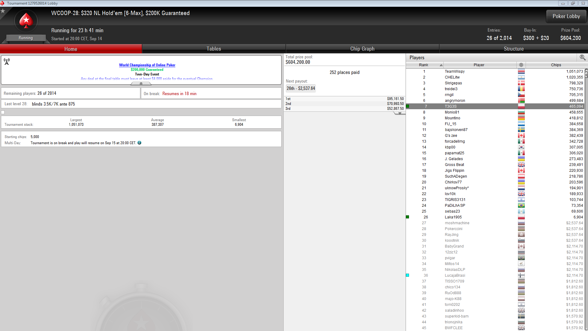 $320 Holdem 6max #28, gdzie walczą : T3G3S (465,094) i Laka1905 (6,904). Blindy 3/6k ante 750