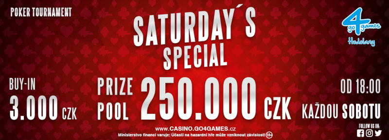 Sobotni program jest bardzo atrakcyjny dla pokerowych graczy. Największy, regularny turniej na Morawach – Saturday Special – rozpoczyna się o godz. 18:00.