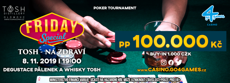W planie gier na piątek znajdziecie turniej specjalny z gwarantowanymi 100.000 CZK. Do gry możecie przystąpić za jedyne 1.000 CZK. Na start otrzymacie 30.000 żetonów, a blindy będą zmieniały się co 20 minut.