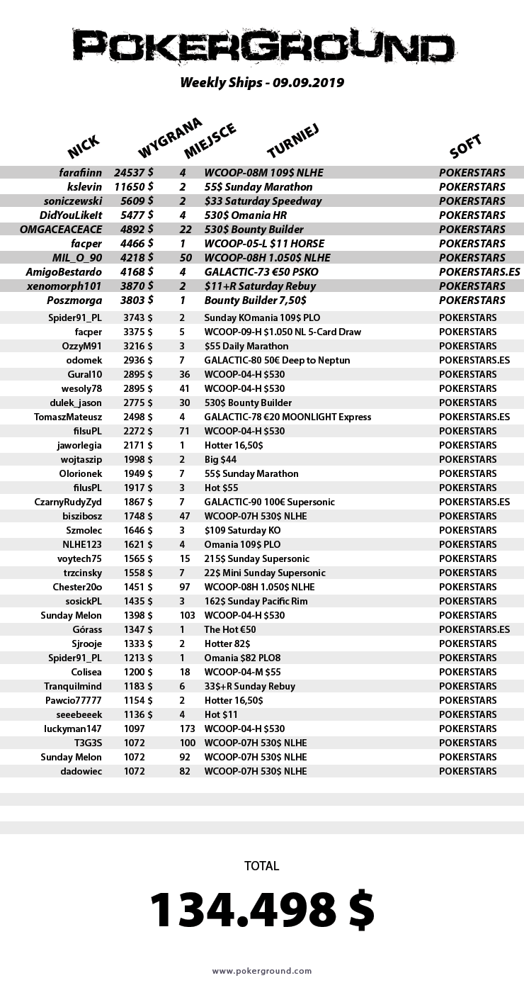 UWAGA: Wyniki zostały zebrane od godziny 7:00 w piątek do godziny 9:00 w poniedziałek. Jeśli nie widzisz swojego wyniku – 1.000$+ bez bounty – napisz na fanpage PokerGround po Polsku na Facebooku.