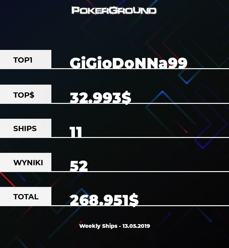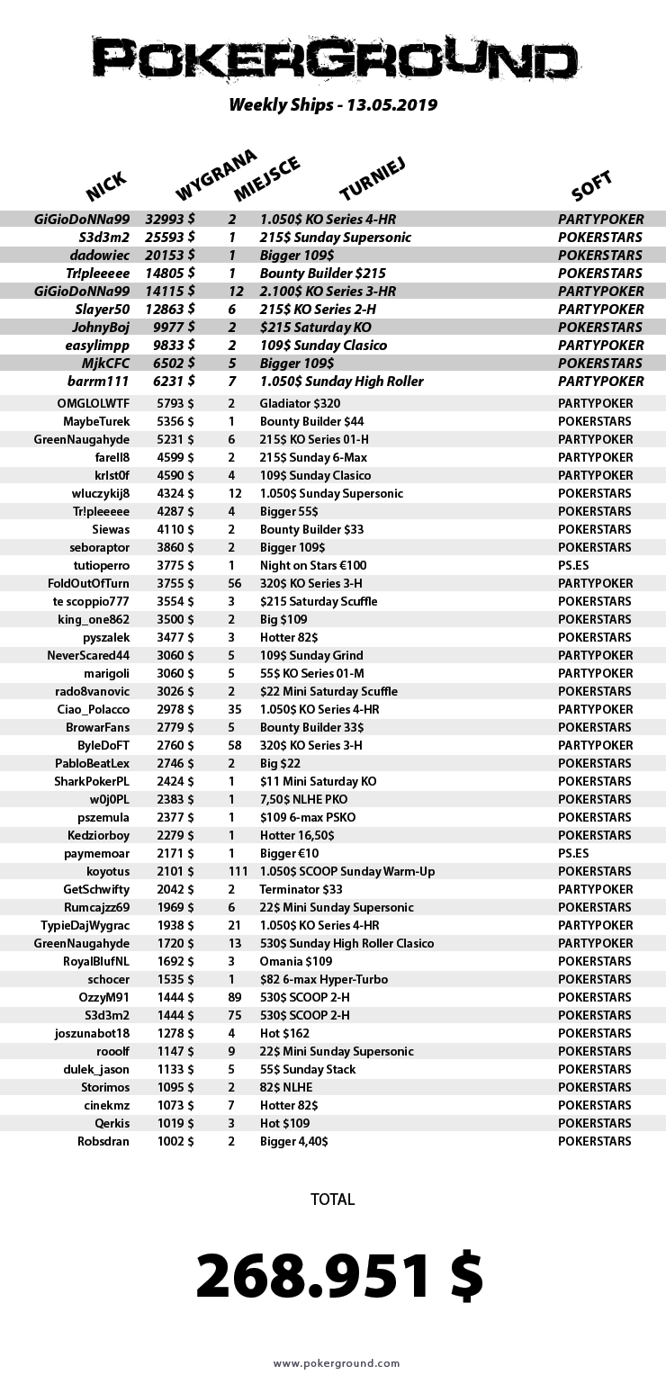 W ostatni weekend gracze z Polski punktowali 53 razy. Wartość wygranych, które przekraczają 1.000$ bez bounty wyniosła aż 268.951$.