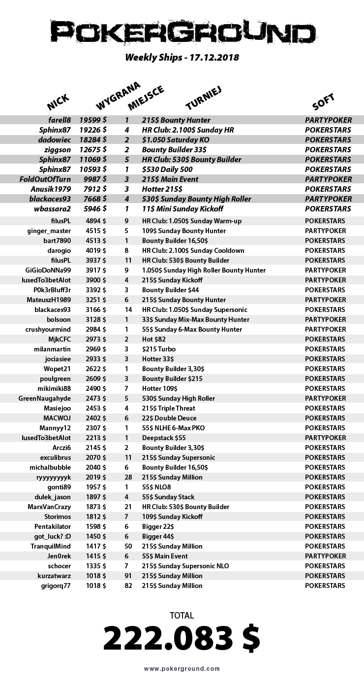 W ostatni weekend gracze z Polski punktowali 48 razy. Wartość wygranych, które przekraczają 1.000$ bez bounty, wyniosła aż 222.083$.