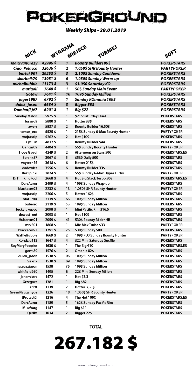 UWAGA: Weekly Ships uwzględnia rezultaty z PartyPoker (wszystkie) oraz z PokerStars.EU i ES z turniejów, które w lobby oznaczone są kolorami czerwonym, niebieskim i żółtym. Wyniki zostały zebrane od godziny 6:00 w sobotę do godziny 7:00 w poniedziałek. Jeśli nie widzisz swojego wyniku – 1.000$+ bez bounty – napisz na fanpage PokerGround Polska na Facebooku.