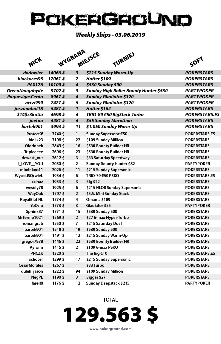 UWAGA: Wyniki zostały zebrane od godziny 7:00 w sobotę do godziny 8:00 w poniedziałek. Jeśli nie widzisz swojego wyniku – 1.000$+ bez bounty – napisz na fanpage PokerGround po Polsku na Facebooku.