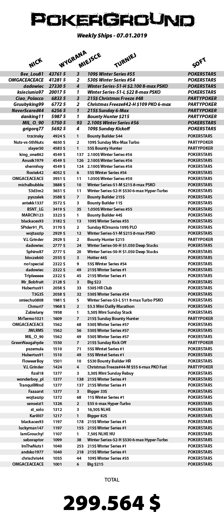 W ostatni weekend gracze z Polski punktowali 65 razy. Wartość wygranych, które przekraczają 1.000$ bez bounty, wyniosła aż 299.564$.