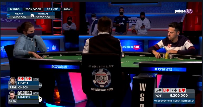 W finałowym starciu na uwagę zasługują właściwie tylko dwa rozdania. Najpierw Mateos wygrał bez showdownu sporą pulę, którą Heath poddał dopiero do trzeciej beczki na riverze. Po tym rozdaniu jego przewaga w żetonach wynosiła jakieś 3:1.