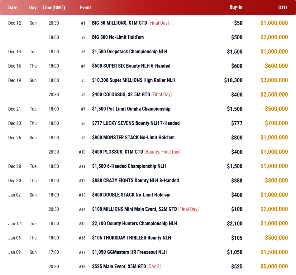 | 12 grudnia | Niedziela | 17:00 | #1: BIG 50 MILLION$, $1M GTD [Day 1] |