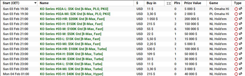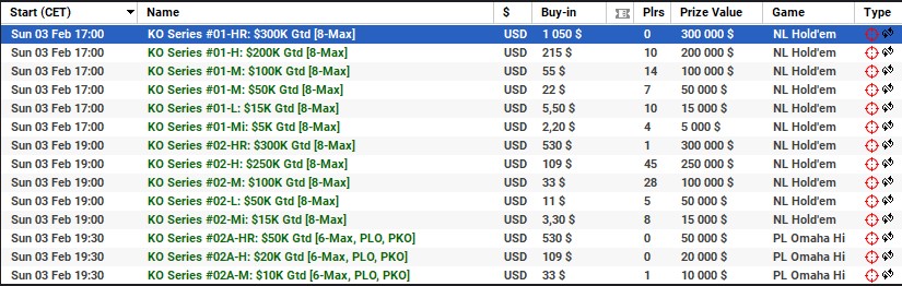 | 3 lutego | 19:00 | 109$ | 250.000$ | KO Series #02-H: $250K [8-Max] |