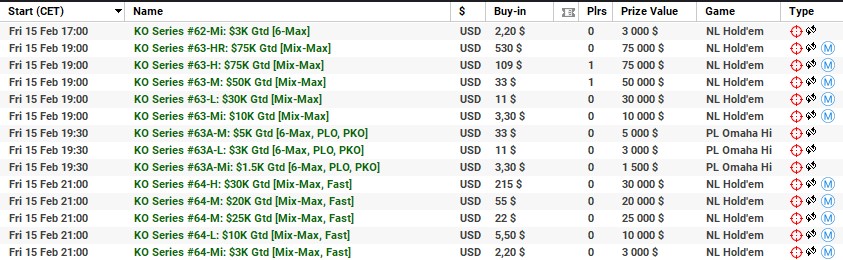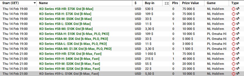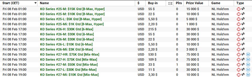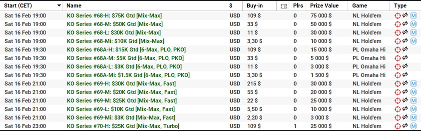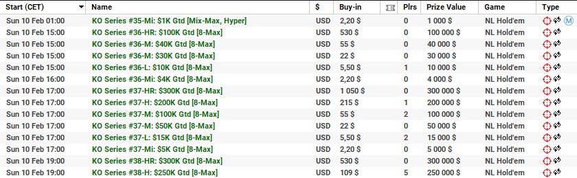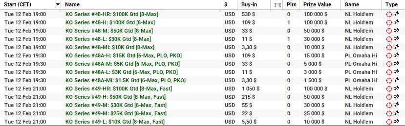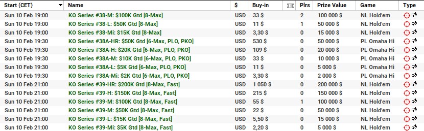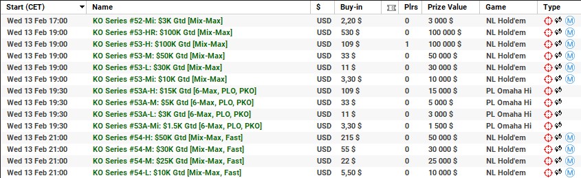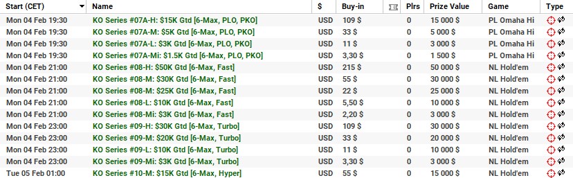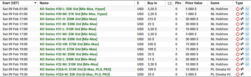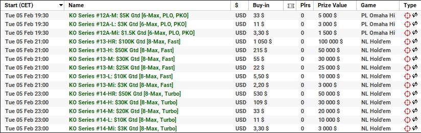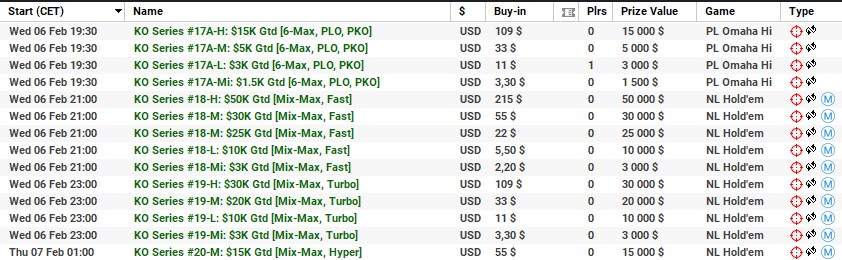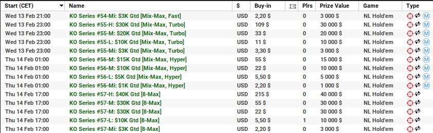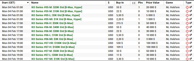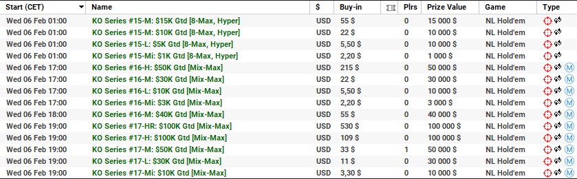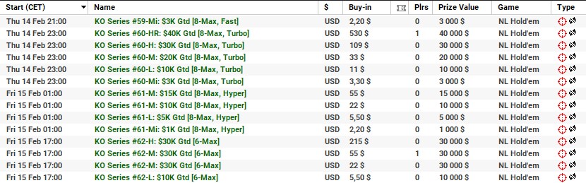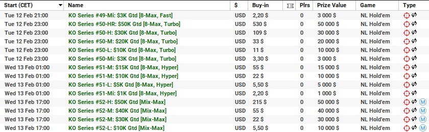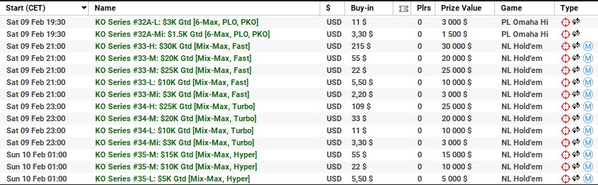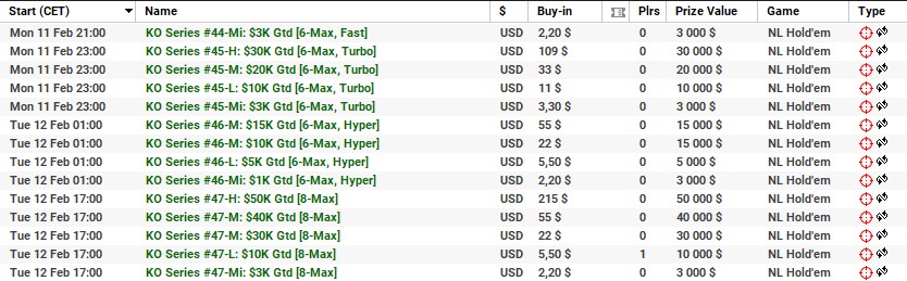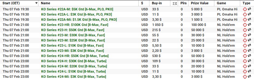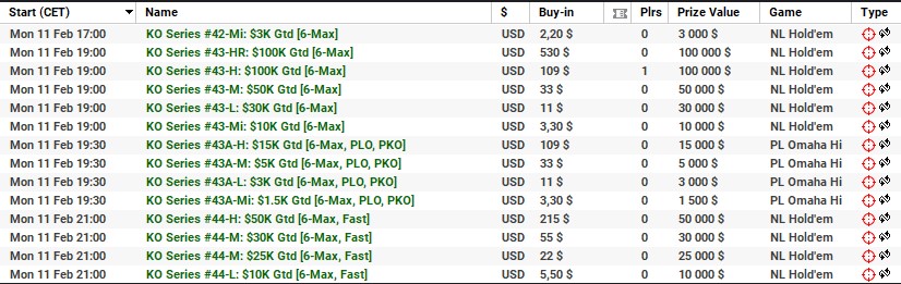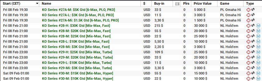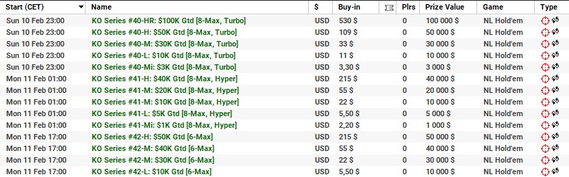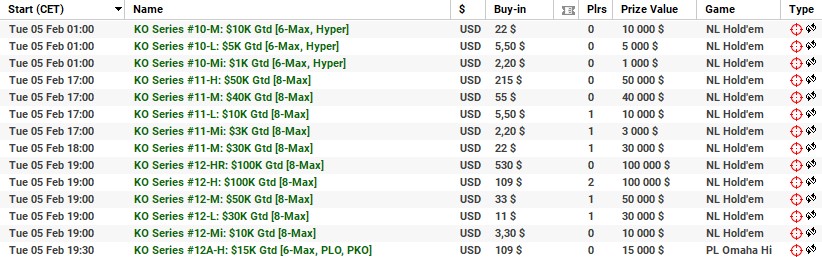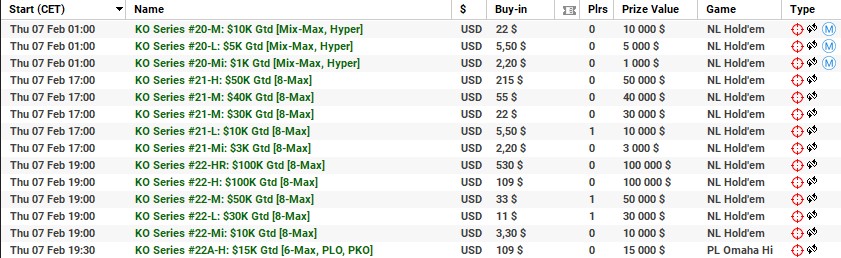 | 10 lutego | 19:00 | 33$ | 100.000$ | KO Series #38-M: $100K [8-Max] |