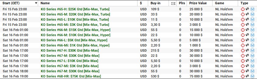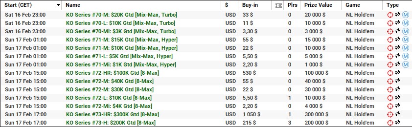 | 17 lutego | 19:00 | 530$ | 500.000$ | KO Series #74-HR: $500K [8-Max] |