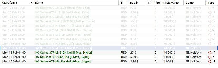 | 17 lutego | 19:00 | 33$ | 100.000$ | KO Series #74-M: $100K [8-Max] |