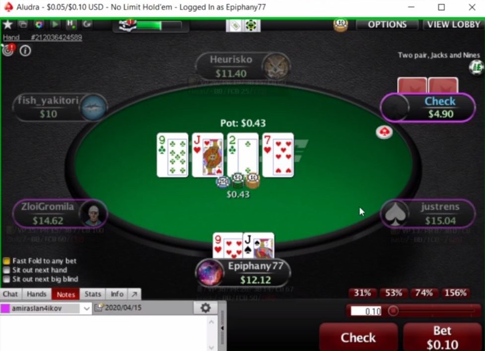 Przyjrzyjmy się rozdaniu, które Carrel rozegrał w czasie ostatniej sesji. Brytyjczyk (J9) bronił blinda do otwarcia z BTN. Na flopie trafił dwie top pary i zaczekał. Rywal nie zdecydował się na c-bet i zobaczyliśmy turn.
