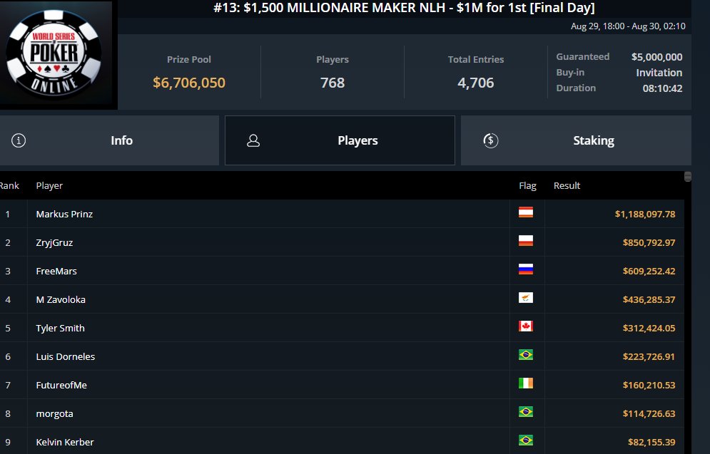Zwycięzca turnieju w heads-upie pokonał Polaka występującego pod nickiem ZryjGruz. Nasz zawodnik zajął zaszczytne 2. miejsce i dzięki temu zainkasował 850.793$. Jest to jedna z największych jednorazowych wygranych w historii polskiego pokera online (wcześniej były już milionowe).